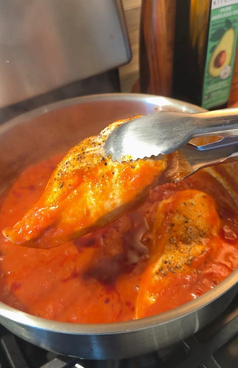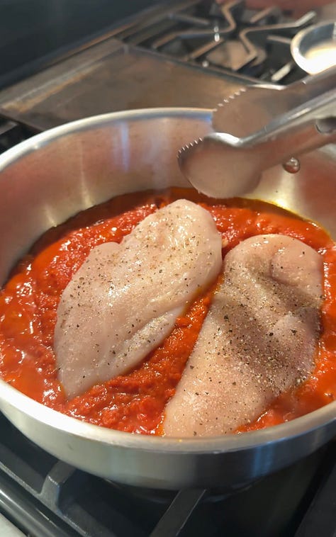 The thing I love about this recipe is that while the chicken simmers, it releases its flavorful juices into the marinara, adding a richness you can’t get by just searing a piece of chicken.